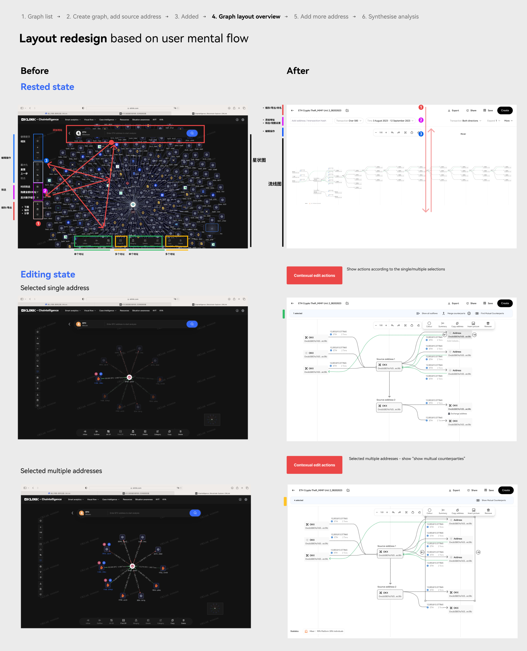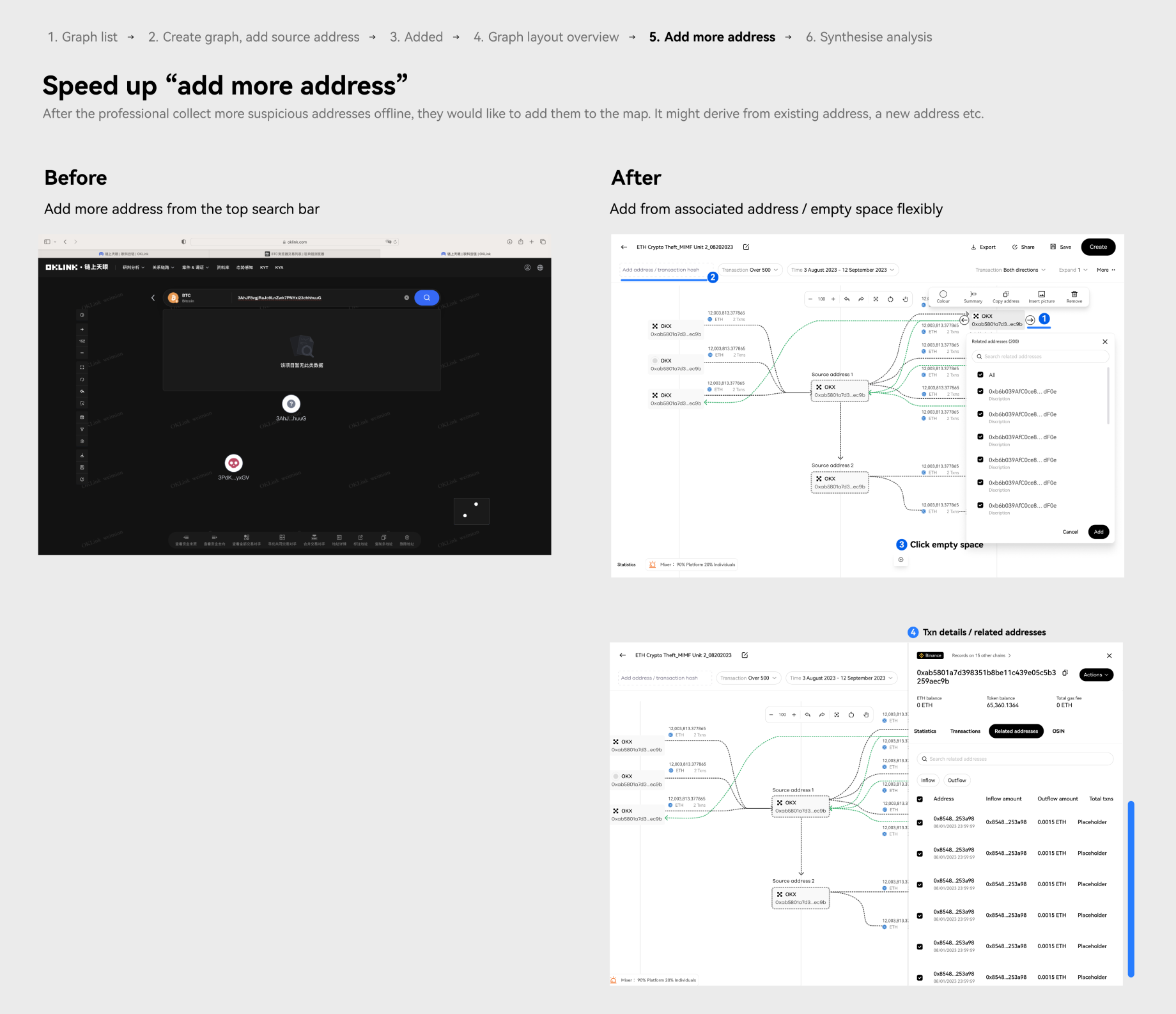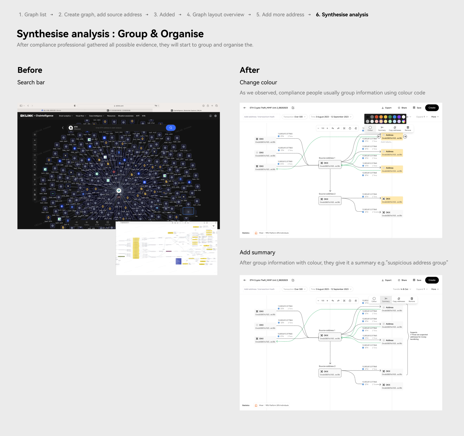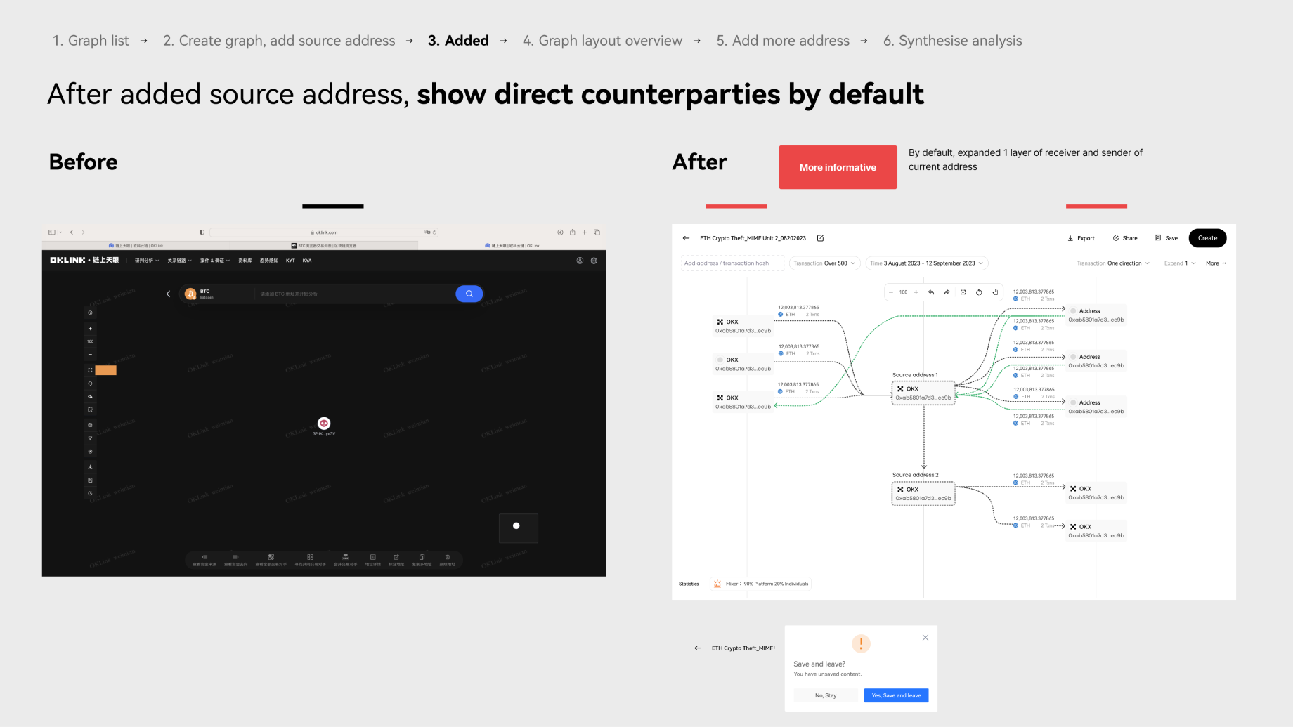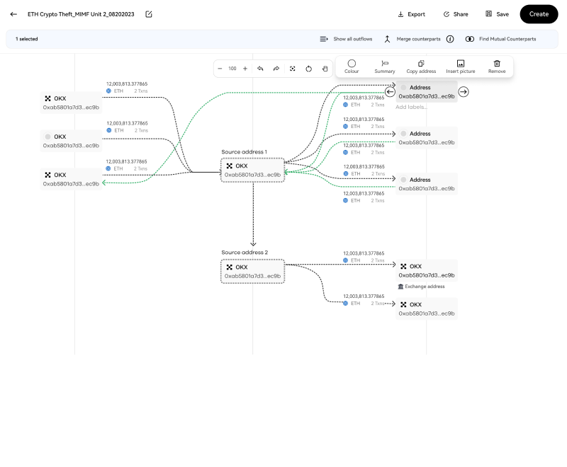• When the compliance team gets alerts from the system, like when a big transaction happens between an address and a flagged one, they will dig deeper to find out who else is involved and how much money is moving by looking at the graph.