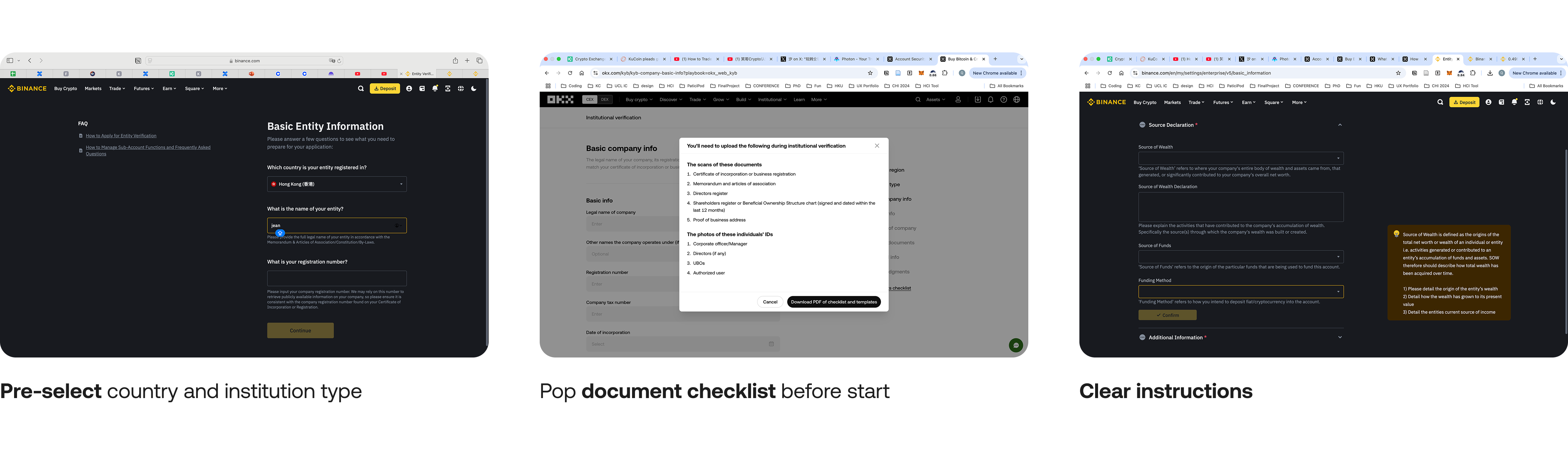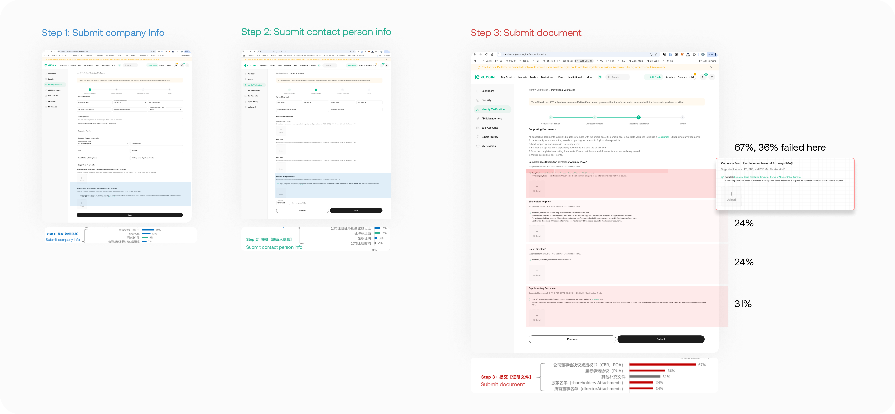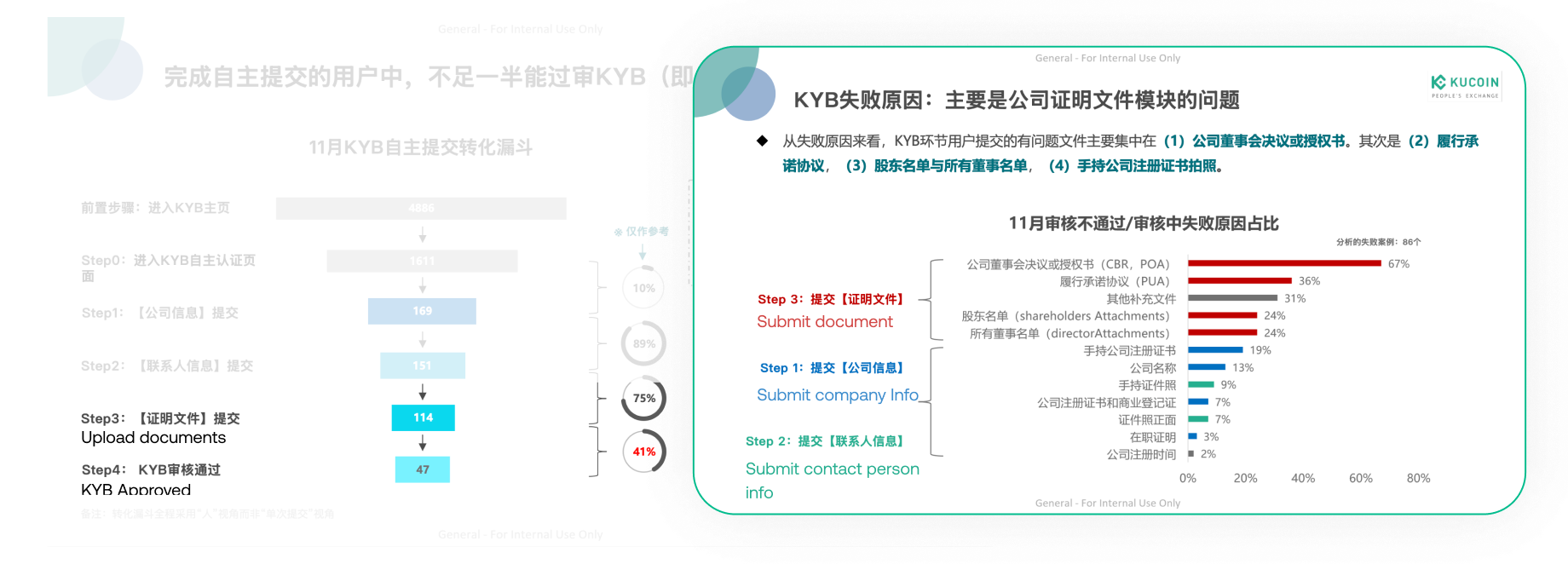 · User research indicates low conversion rates in the KYB verification step due to unclear instructions.