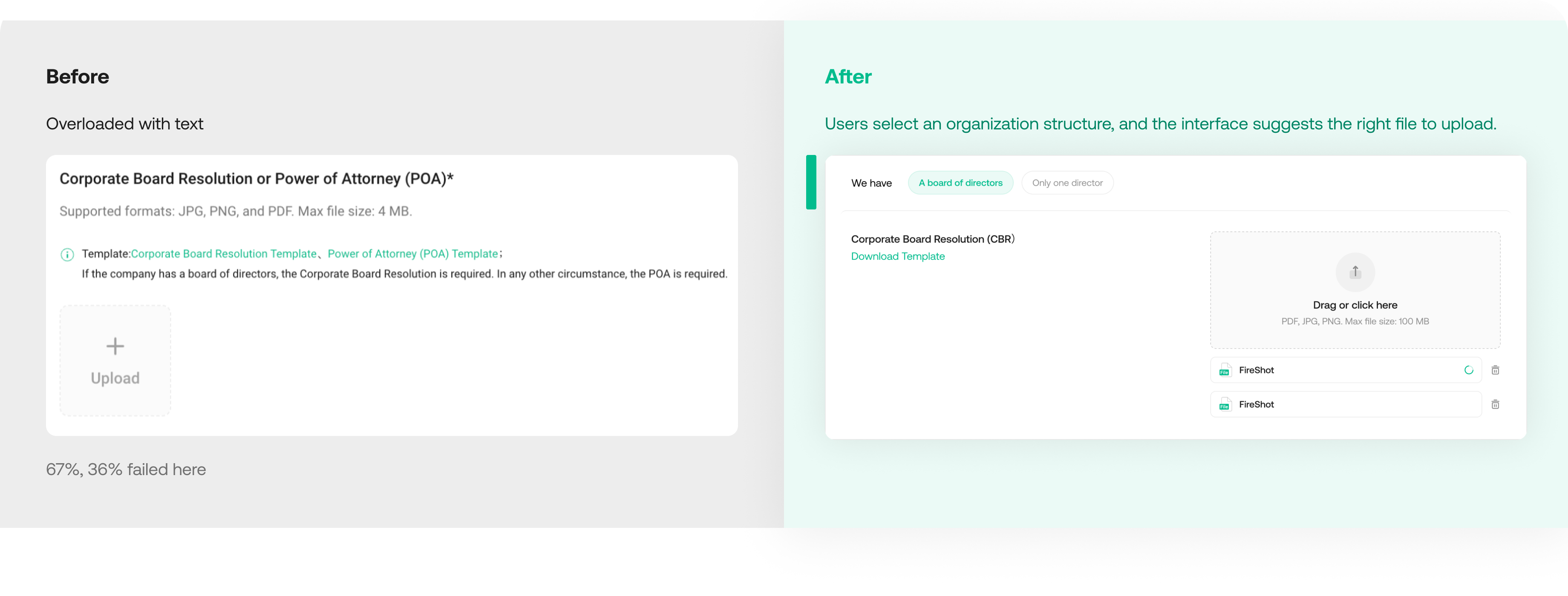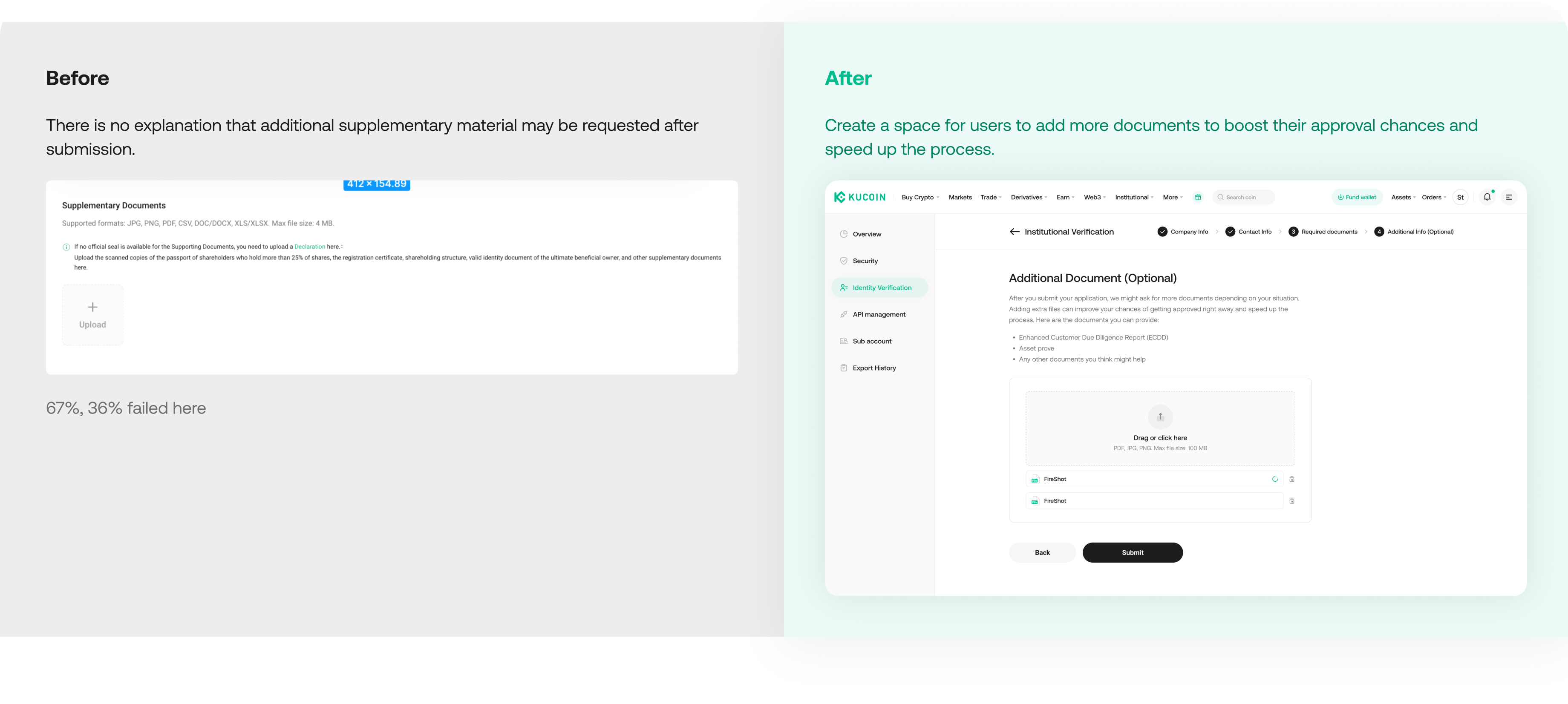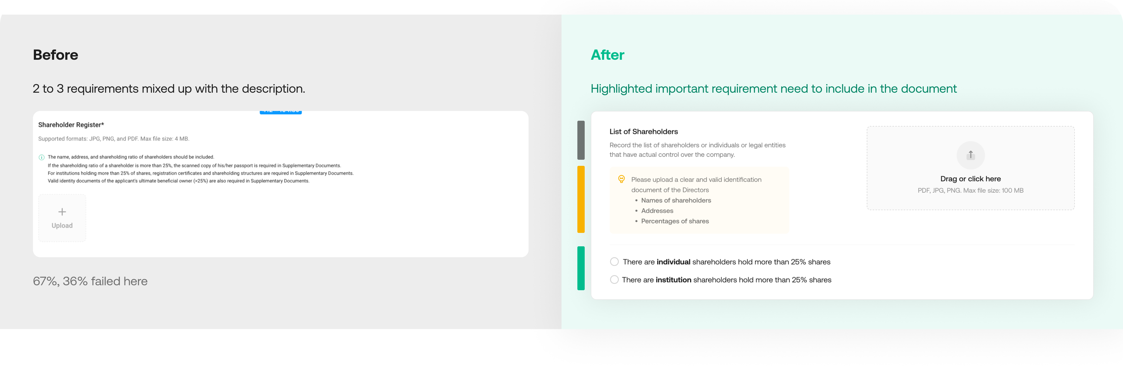 · The conversion rate for document uploads is notably low at 41%, primarily because users are often confused about which materials to upload in various scenarios. The previous design failed to provide the necessary clarity and guidance.