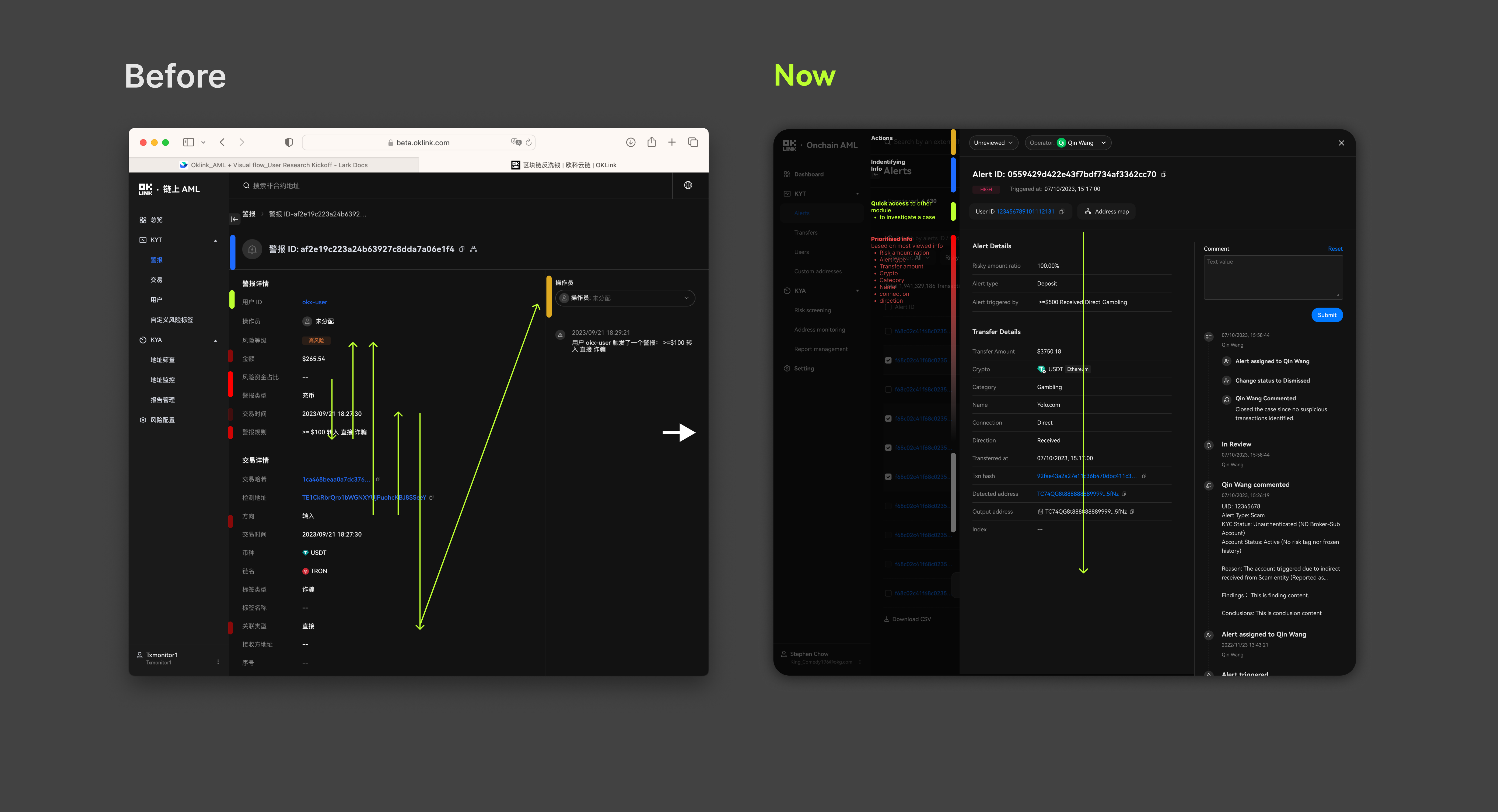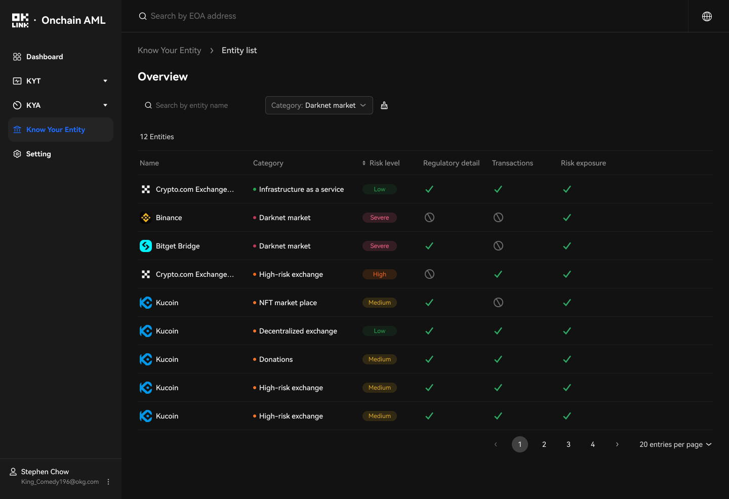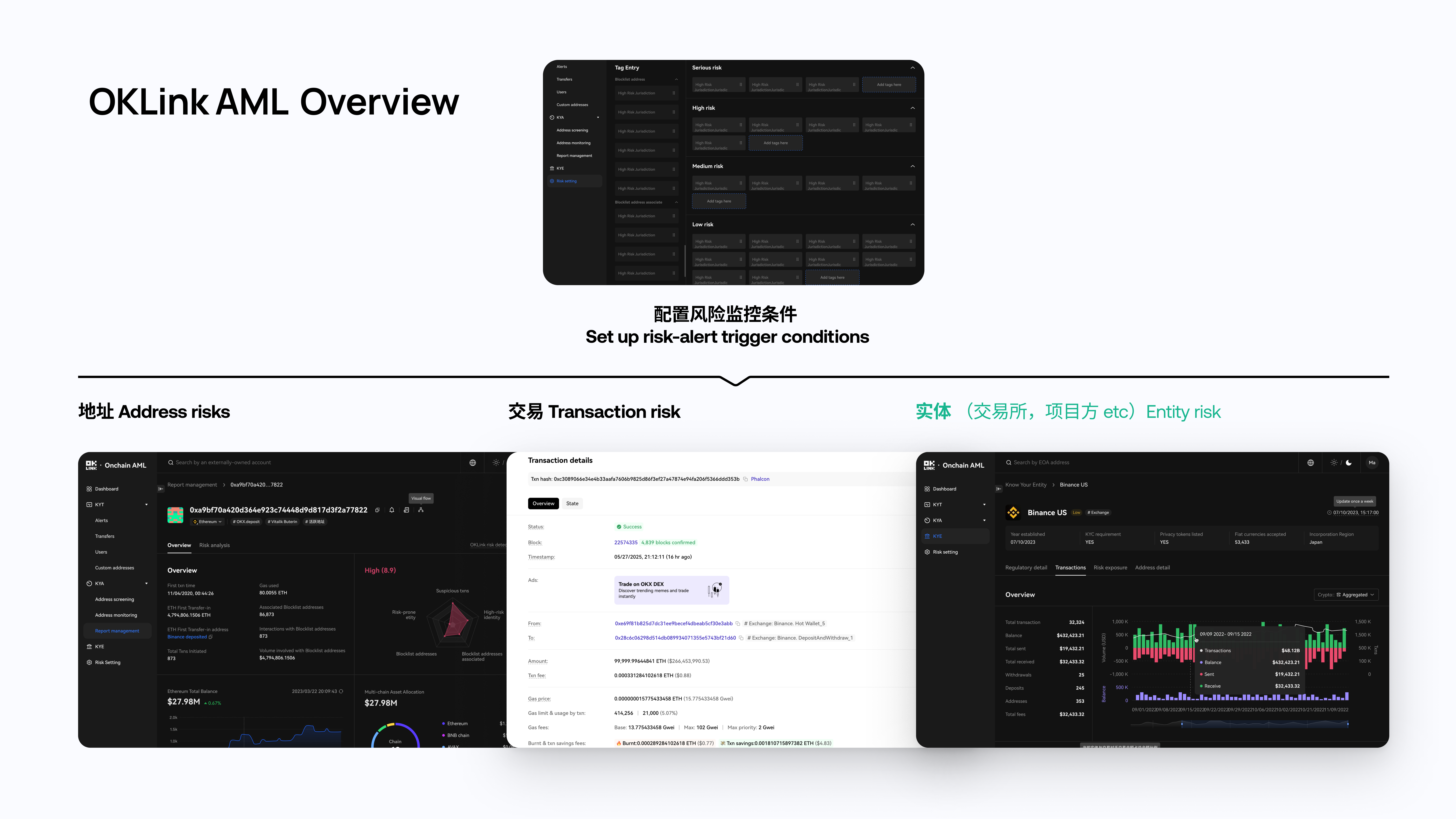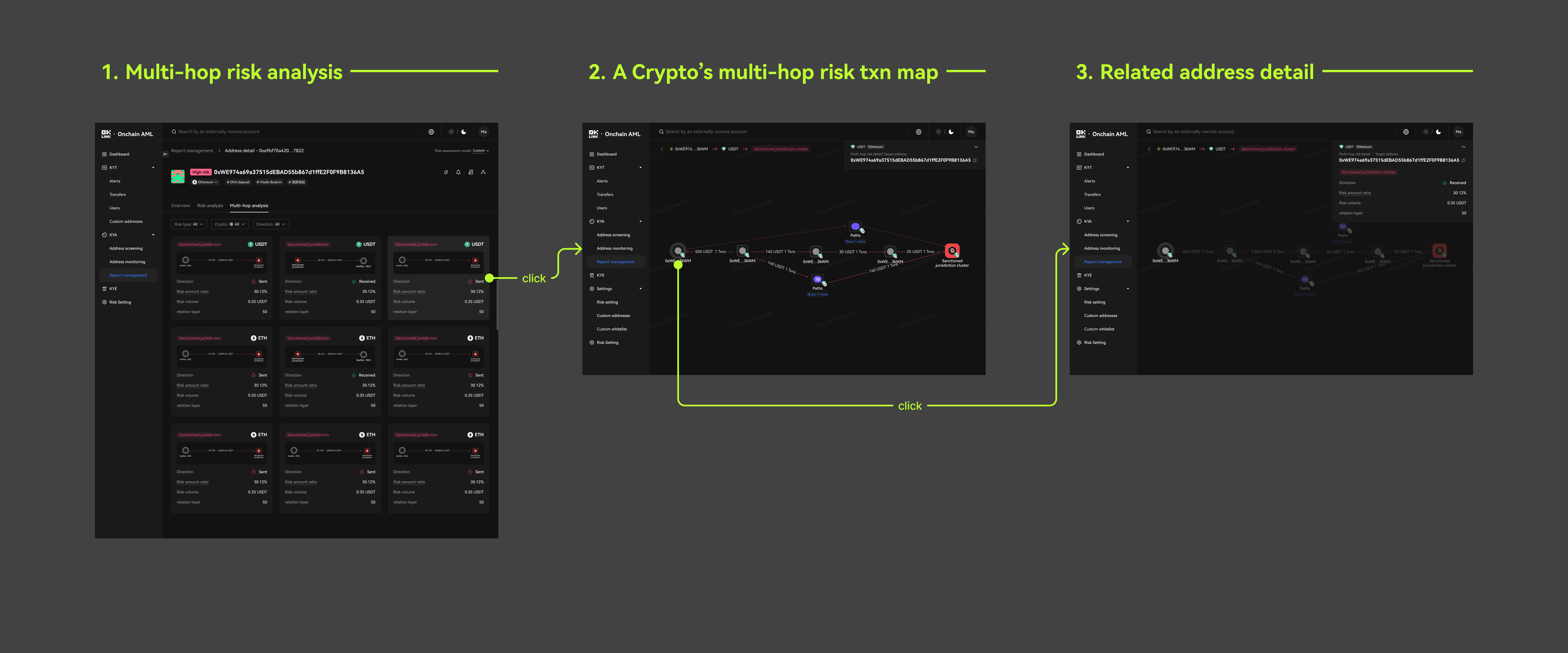 Onchain AML: A platform that helps compliance officers analyze the risks associated with cryptocurrency entities and addresses by visualizing transaction flows and address information.